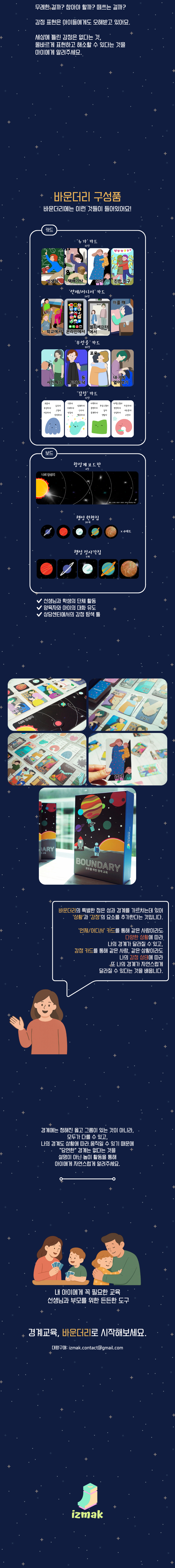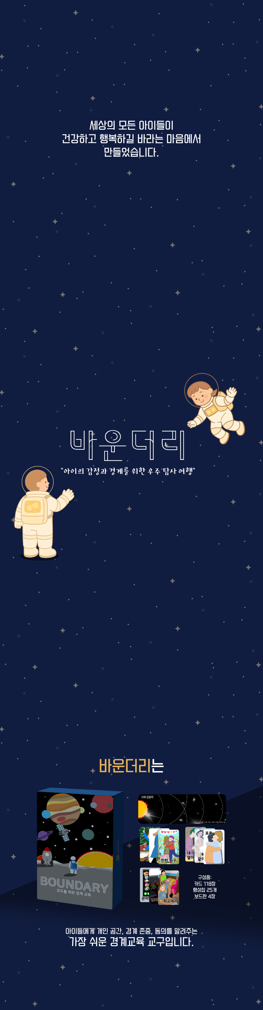 바운더리는 항성계와 우주 여행을 소재로 아이들에게 가장 중요한 경계와 감정에 대해 쉽고 재미있게 가르치는 교구입니다.
